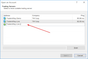To add the TradersWay-Live 2 server to your platform in an alternative fashion, click ‘File’ > ‘Open an Account’ and double click “add new broker like ‘Brokername’ or address”. Type TradersWay-Live 2 into this area exactly as shown. Capital letters, dashes and spaces must match or the server won’t add properly. Hit ‘Enter’ and the server will be added to the list.